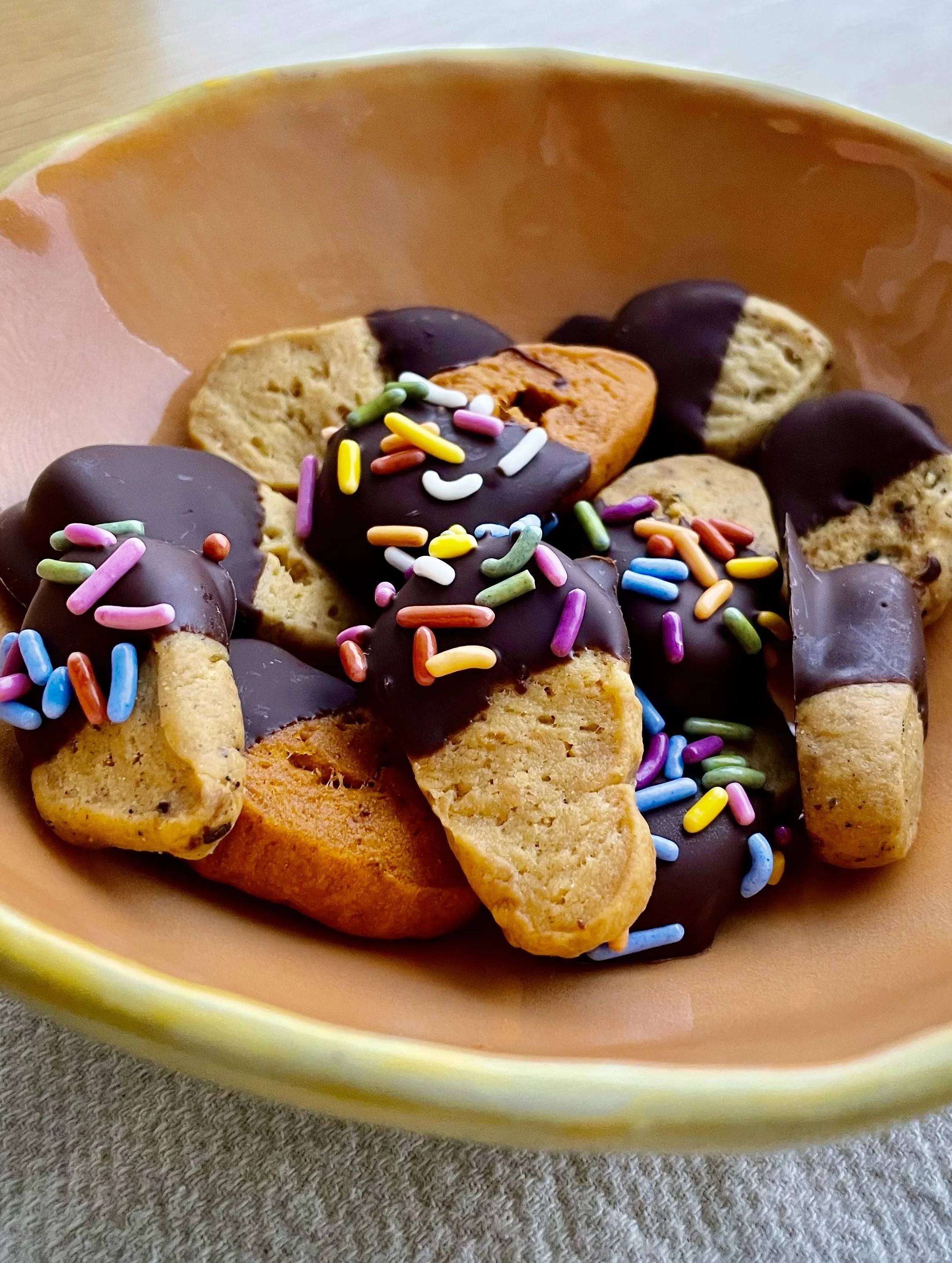 These chocolate-dipped freselles combine bold, savory flavors with rich dark chocolate for a spectacular sweet-heat experience. Customize with colorful sprinkles or your favorite toppings!